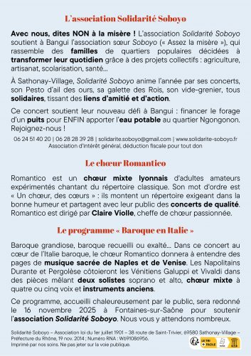 Ce concert au profit d’une association d’aide aux femmes de Centreafrique, L’association SOBOYO de Fontaines sur Saône qui se bat pour obtenir la copnstruction d’un puits dans leur quartier, a été donné le 16 novembre à 15 h 30.